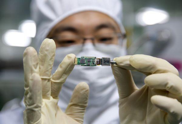 资料图片:2015年11月7日,一名研究人员在位于西安的实验室内向记者展示光子集成芯片。光子集成芯片是通过我国自主研发的光电子集成领域技术制造的芯片,可实现对传统集成电路的“弯道超车”,推动我国在光电子集成电路领域从“跟跑者”向“领跑者”转变。新华社记者 金立旺 摄